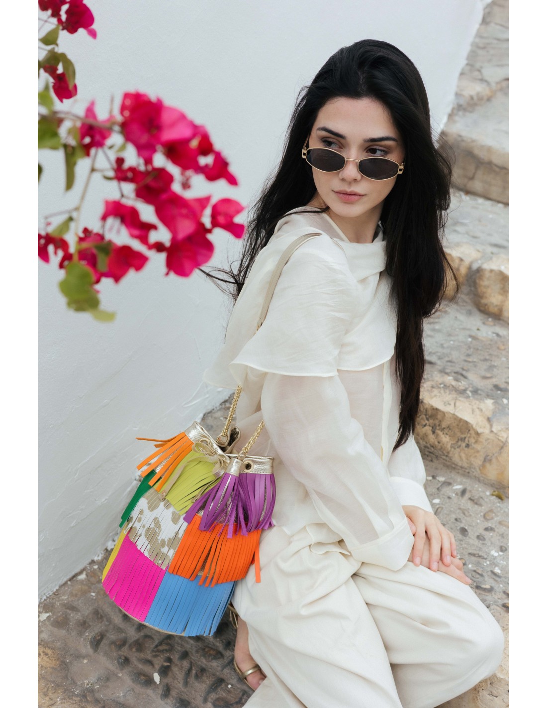 Confeccionado con diez pieles diferentes. La base es de piel dorada y las terminaciones metálicas son de latón dorado.