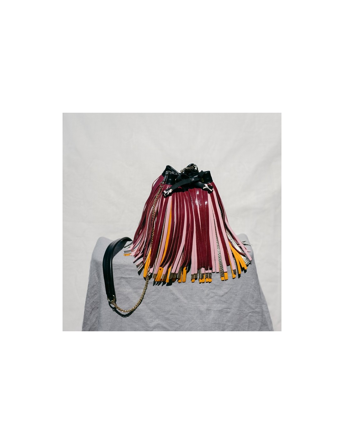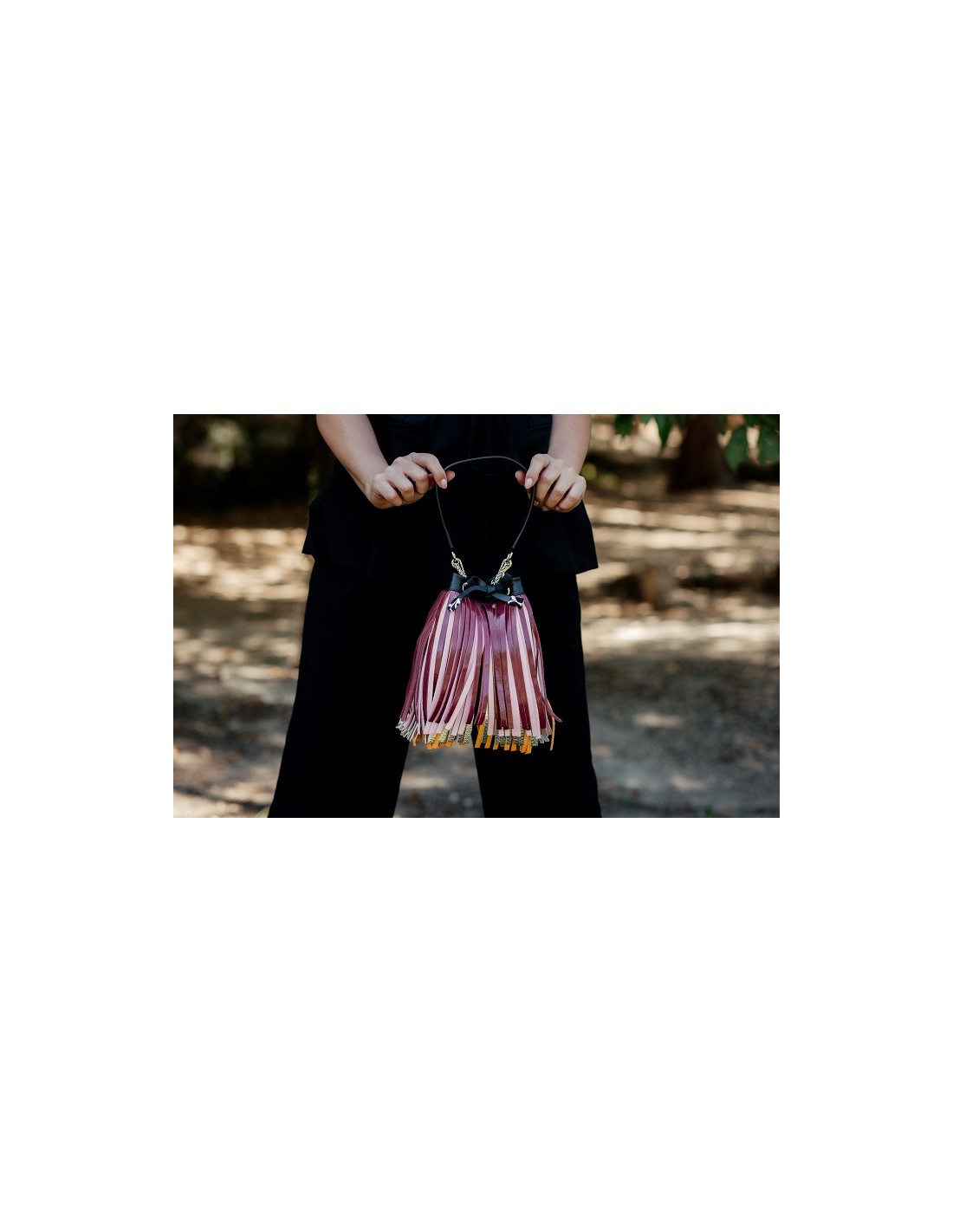 Confeccionado con cinco pieles diferentes. La base es de piel color negro y las terminaciones metálicas son de latón dorado.