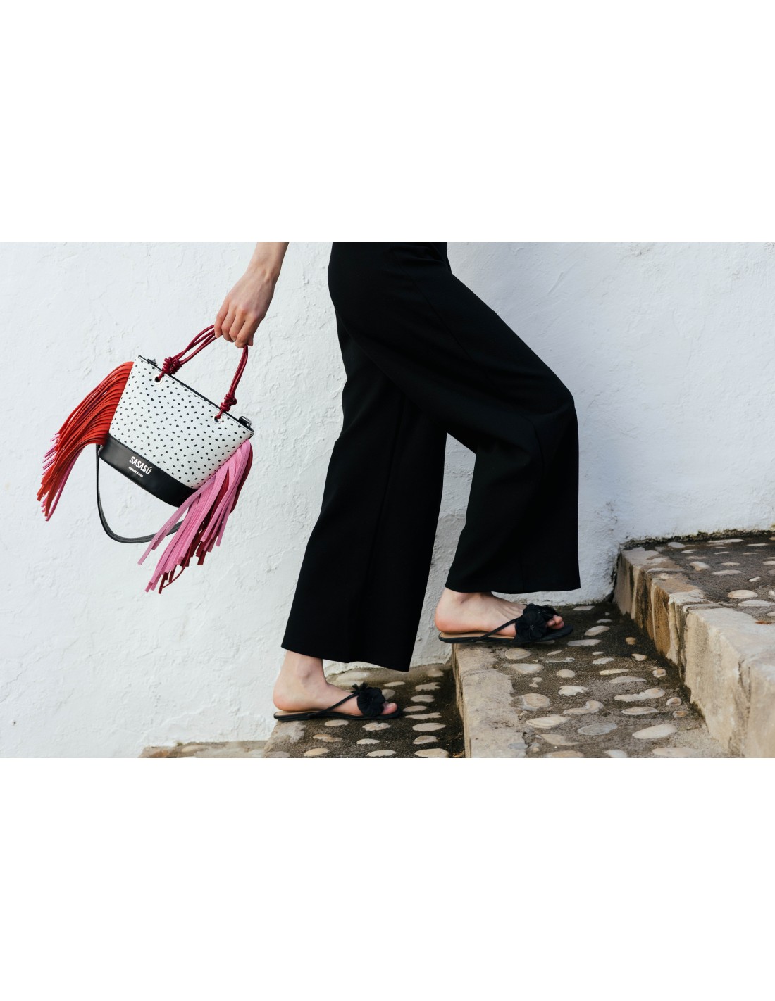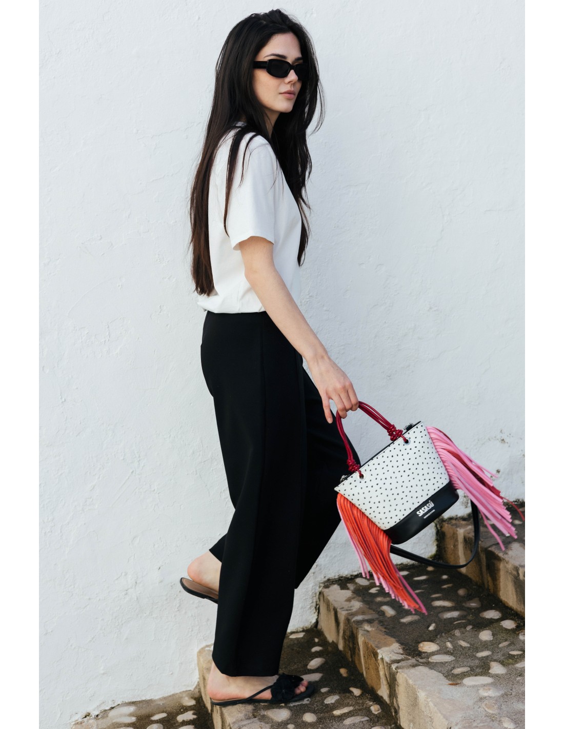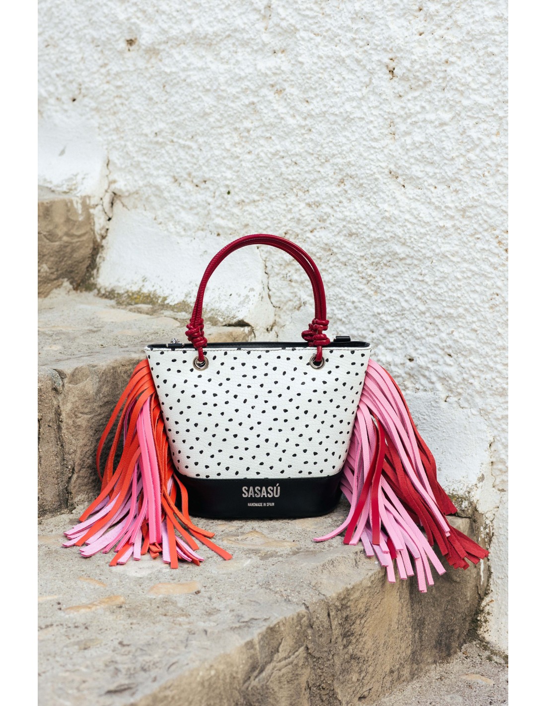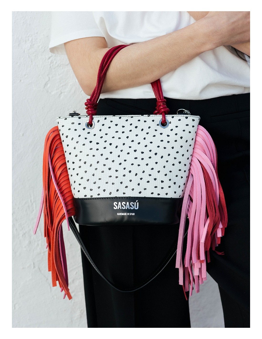 Confeccionado con siete pieles diferentes, la base es de piel negra y la parte frontal de piel blanca grabada y estampada.
