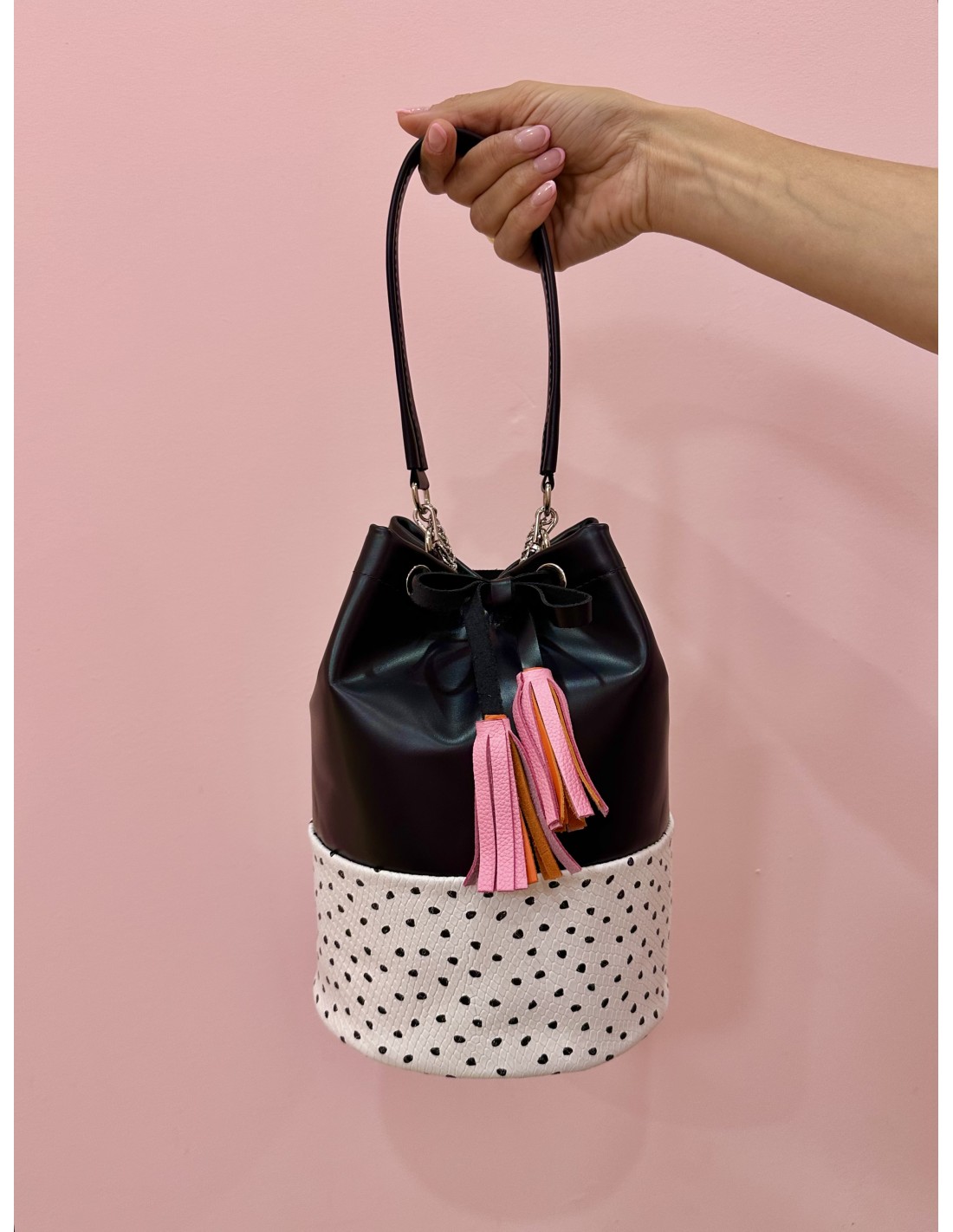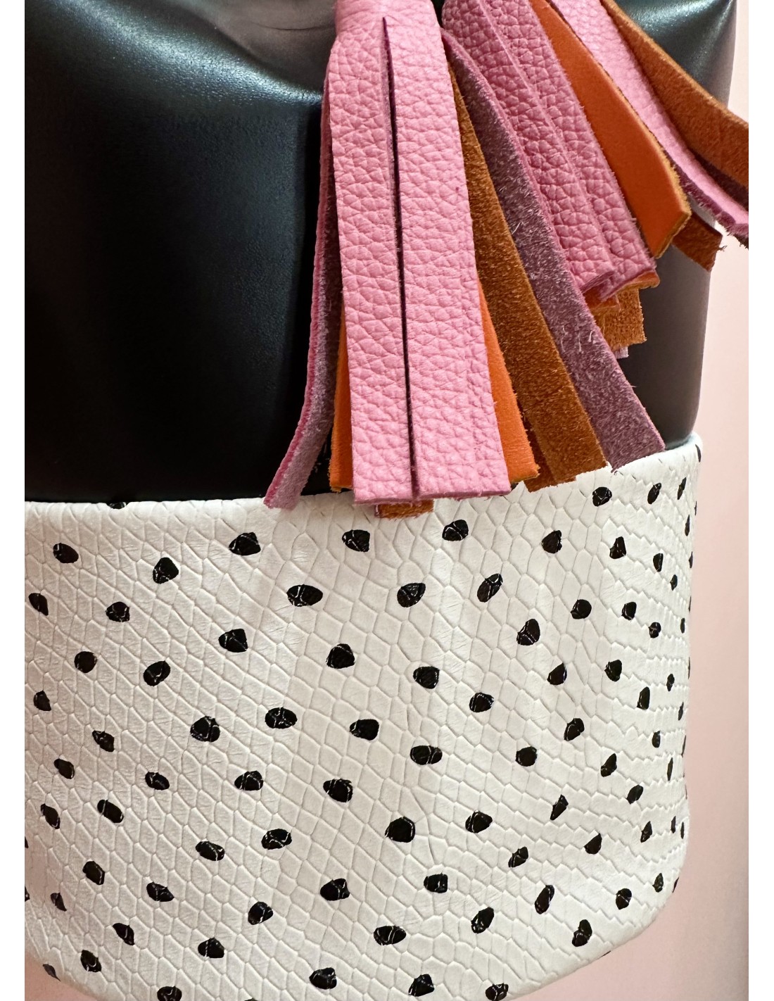 Confeccionado en piel negra y piel blanca grabada y estampada, las borlas son de piel en color rojo y rosa.
