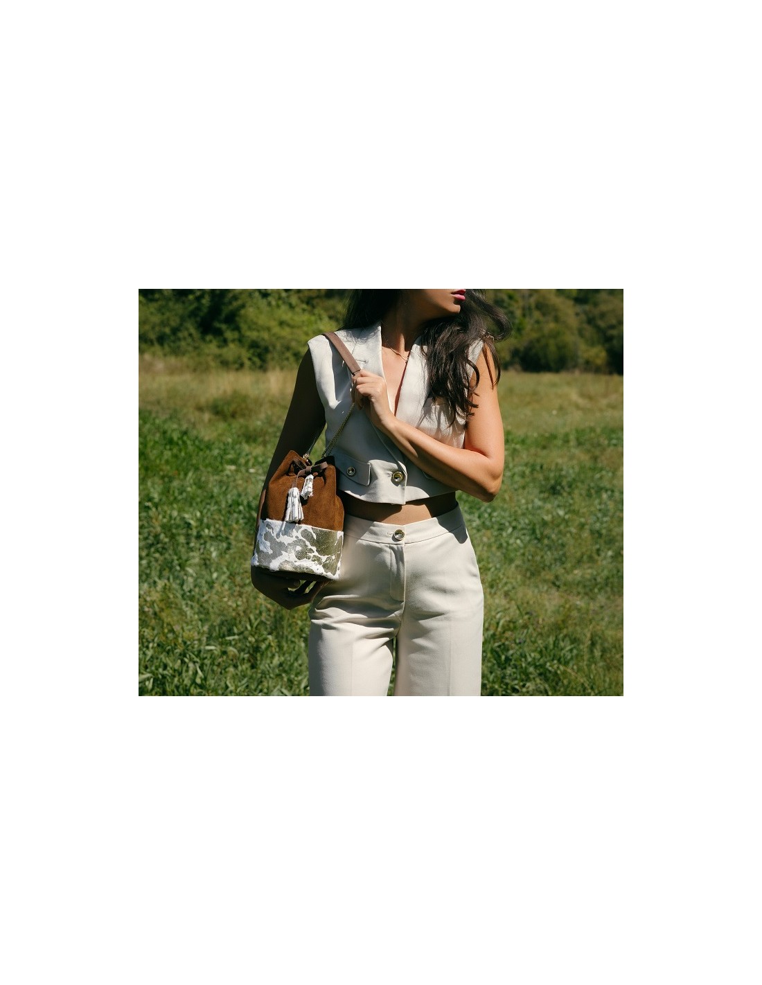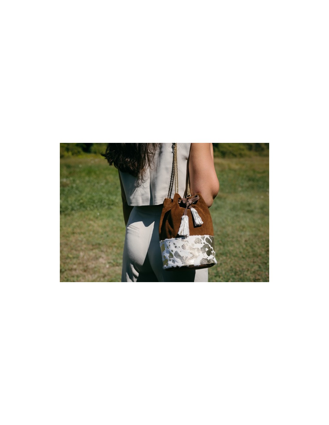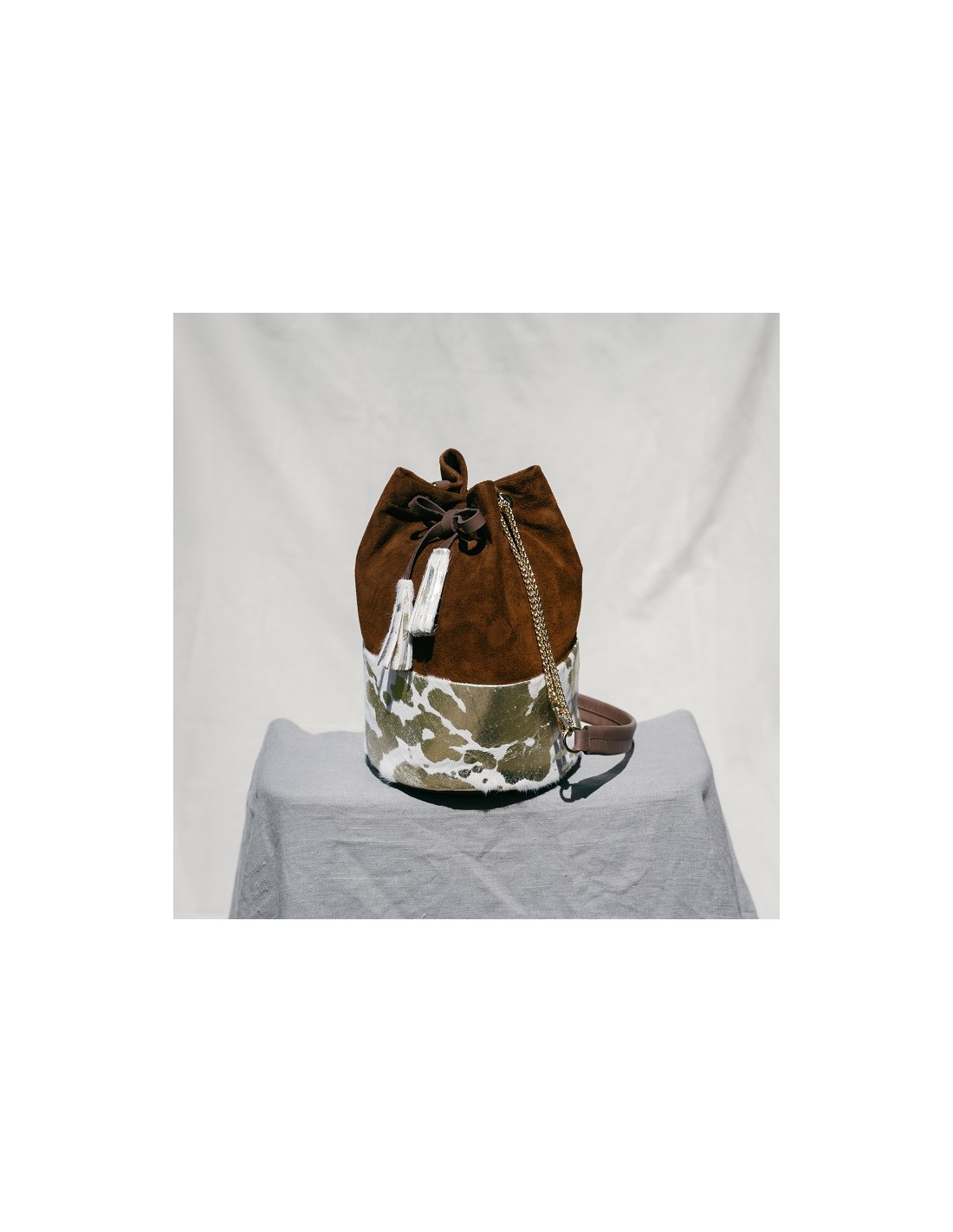 Confeccionado piel de serraje en color marron caramelo y pelo de vacuno con print de vaca en dorado metalizado. El cordón y el asa es de piel marrón.