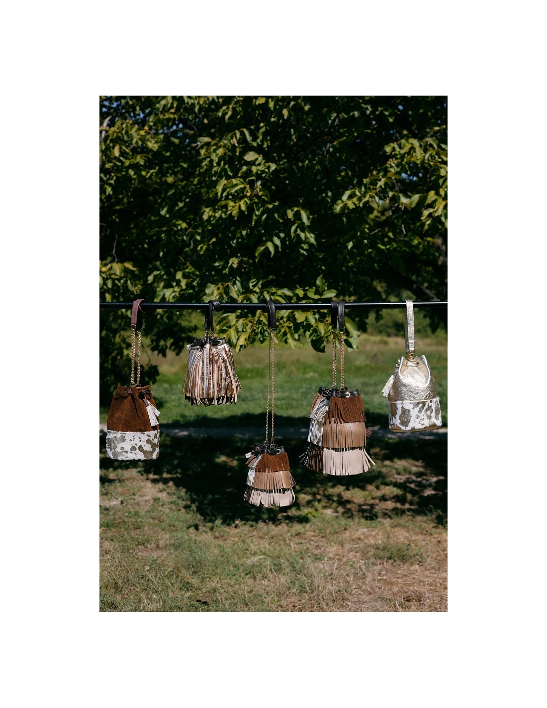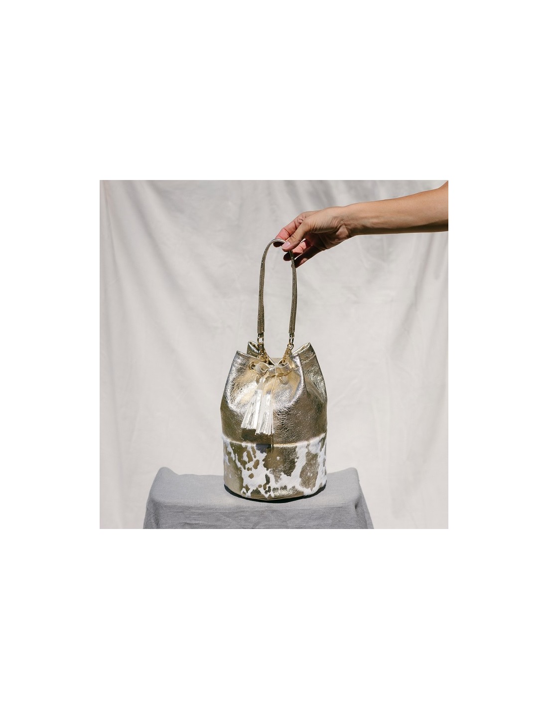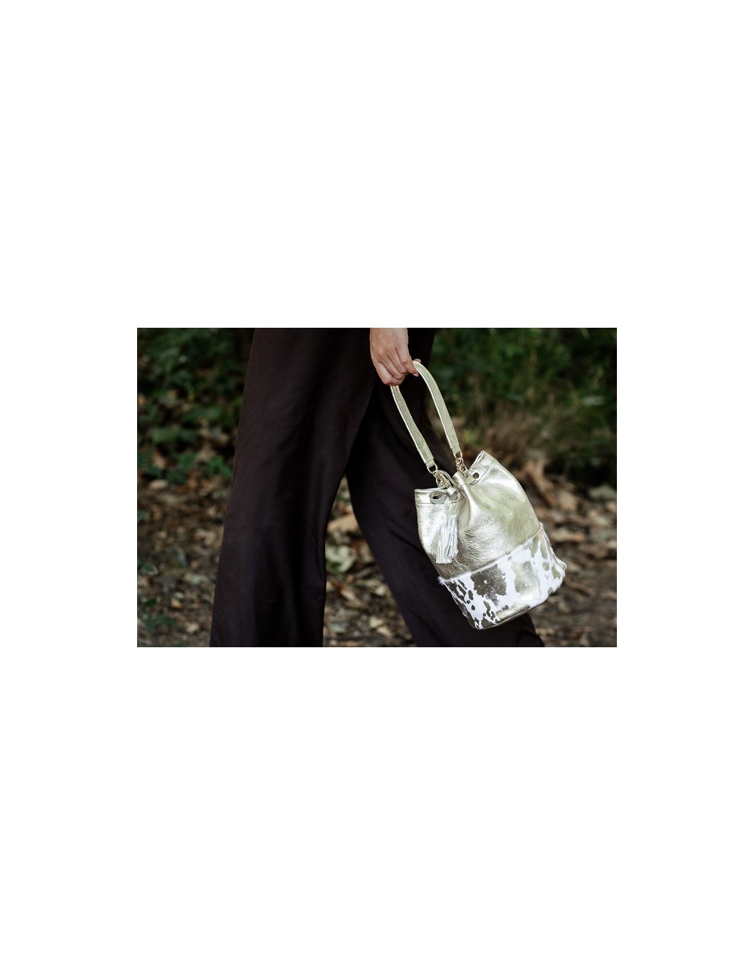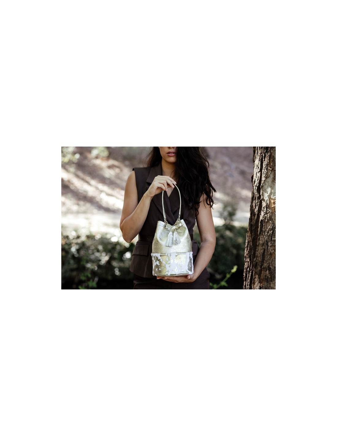 Confeccionado en piel dorada y pelo de vacuno con print de vaca en dorado metalizado.