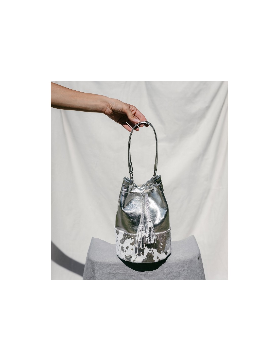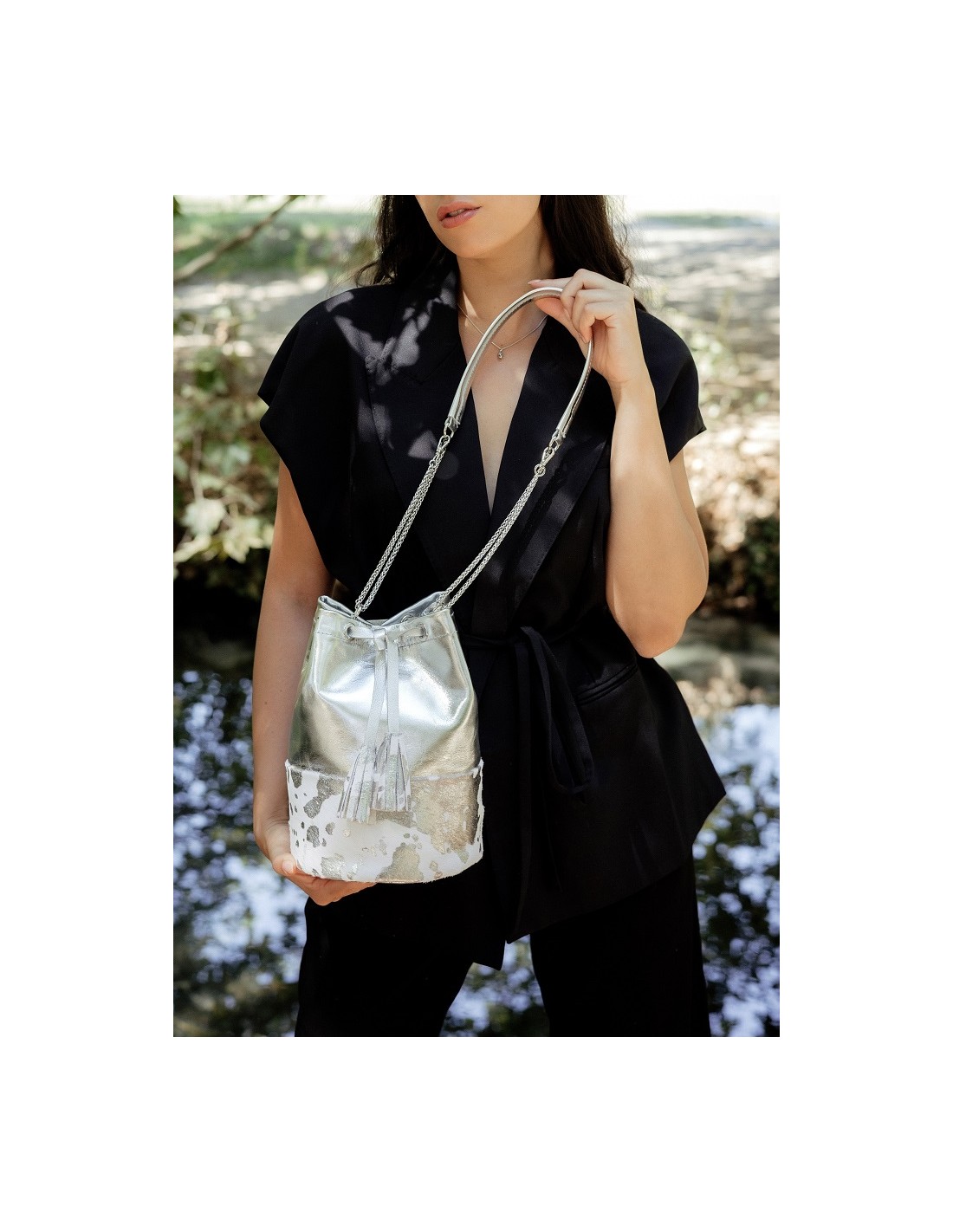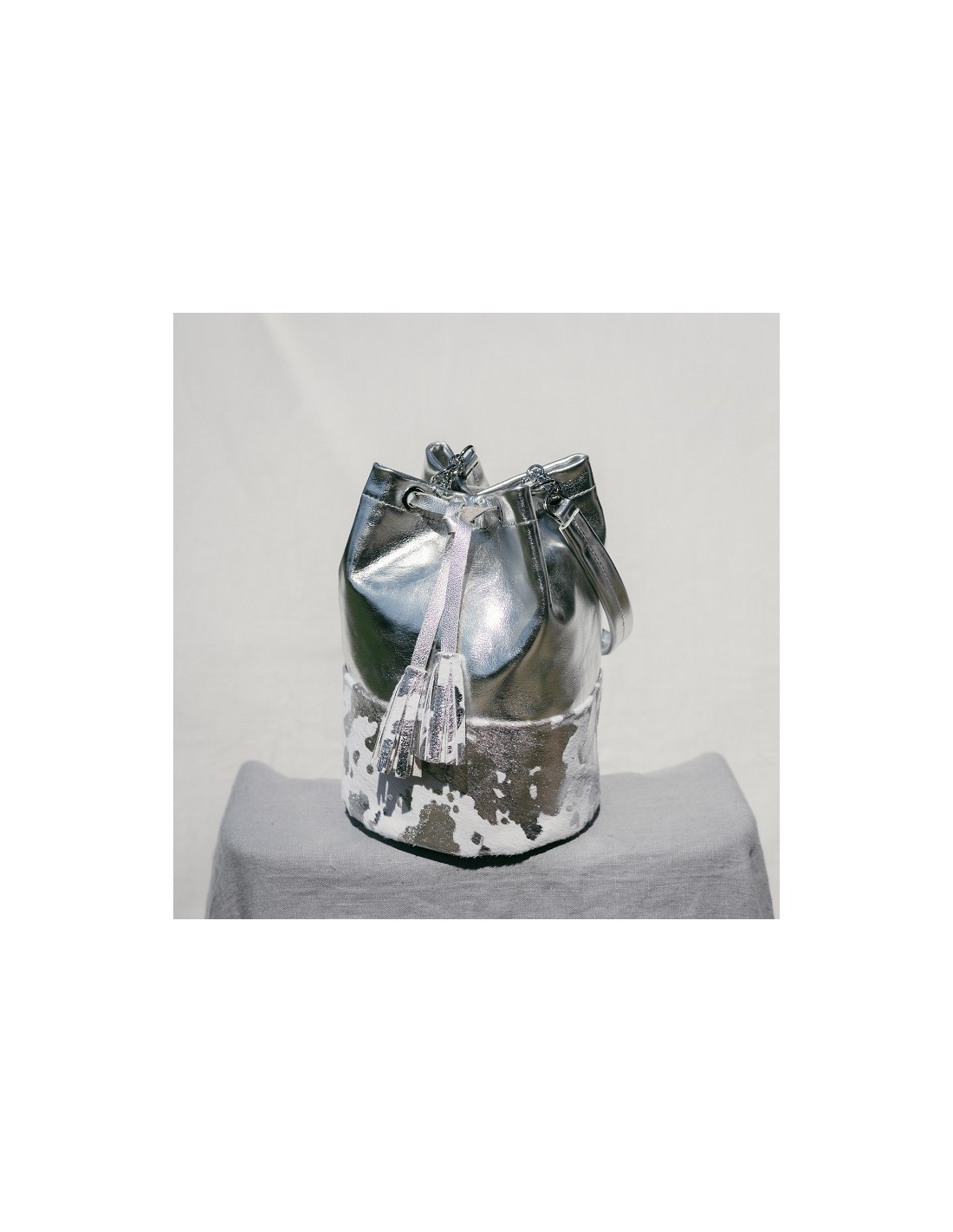 Confeccionado en piel plateada y pelo con print de vaca metalizado en color plata. Las terminaciones metálicas son de latón plateado.